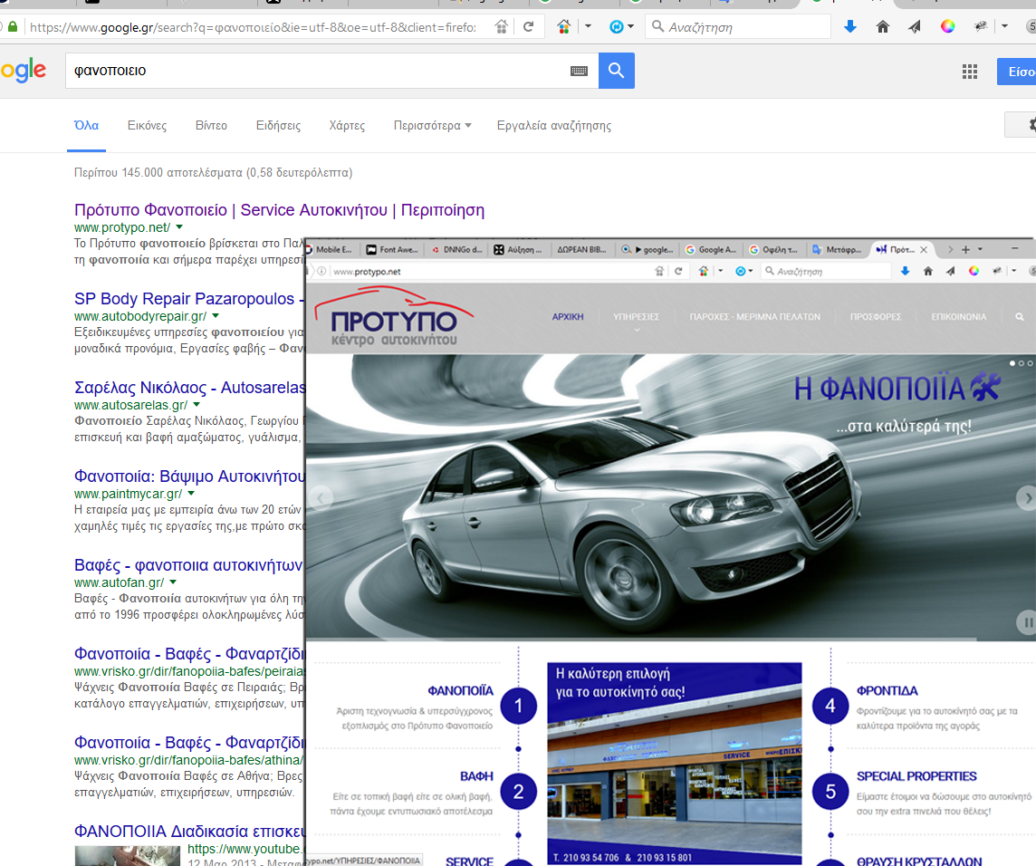 Παράδειγμα: Αναζητώντας τον όρο "φανοποιείο" στην Google, στην 1η σελίδα εμφανίζεται το site www.protypo.net που έχει κατασκευάσει η Optisoft.