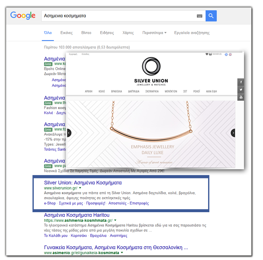 Παράδειγμα: Αναζητώντας τον όρο "ηλεκτρονικά" στην Google, στην 1η σελίδα εμφανίζεται το site www.venieris.com που έχει κατασκευάσει η Optisoft.